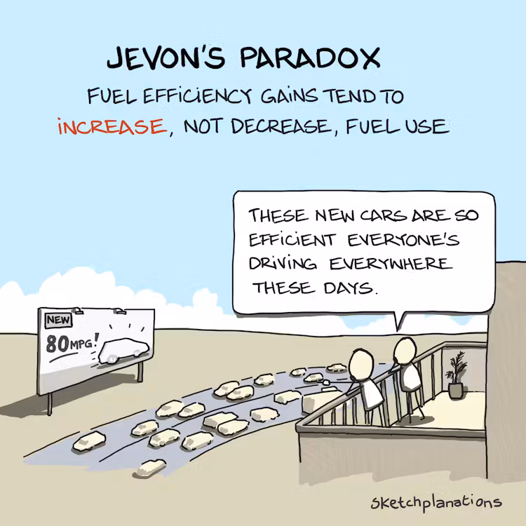 Firstly, let’s talk about the Jevons Paradox. In 1865, the English economist William Stanley Jevons observed that, paradoxically, making coal usage more efficient for steam engines led to increased consumption of coal, not less. This phenomenon, now known as the Jevons Paradox, recurs when efficiency improvements make a resource more accessible, leading to a surge in demand and an increase in total consumption.